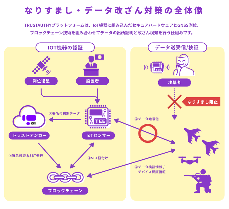 Aerospace Designが設計するUAVの制御システムに、Vlightupのセキュリティモジュール(TEE)を統合する。日本の準天頂衛星システム「みちびき」の信号認証サービスを活用し、機体が受信する位置情報の正当性をハードウェアレベルで検証。AIによるスプーフィング攻撃を無効化するとともに、撮影データに対し改ざん不可能な「位置・時刻」の電子署名を付与することで、情報の出所を数学的に証明する。
