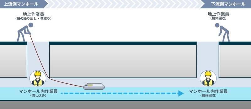 ②下流側のマンホールにて別の作業者が待機し、機体到着後に回収・ひもの取り外しを実施。