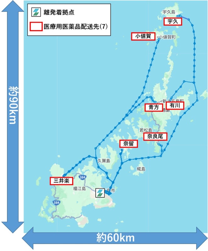配送は、そらいいなが事業拠点を置く長崎県五島列島の各薬局および医療機関向けに、医薬品卸会社4社(翔薬、東七、藤村薬品、宮崎温仙堂商店)との契約に基づき実施する。