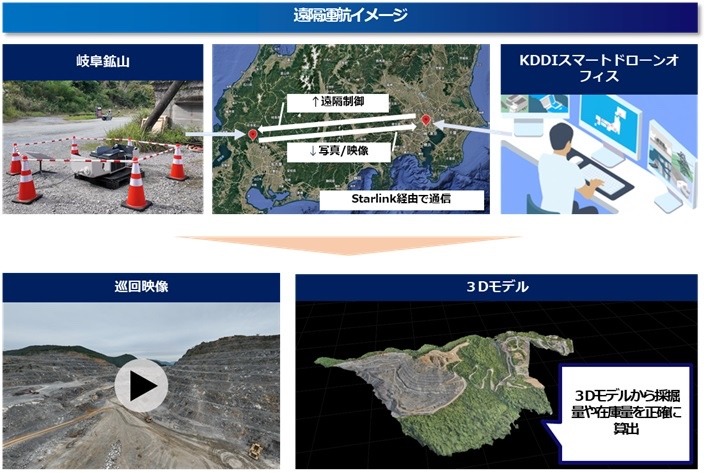 実証では、岐阜鉱山の採掘終了後に残る残壁などを対象に、KDDIスマートドローンの遠隔運航サービスを活用し、特性の異なる2種類のドローンポート(Skydio Dock for X10、DJI Dock 3)による遠隔自動巡視と3次元測量を実施した。