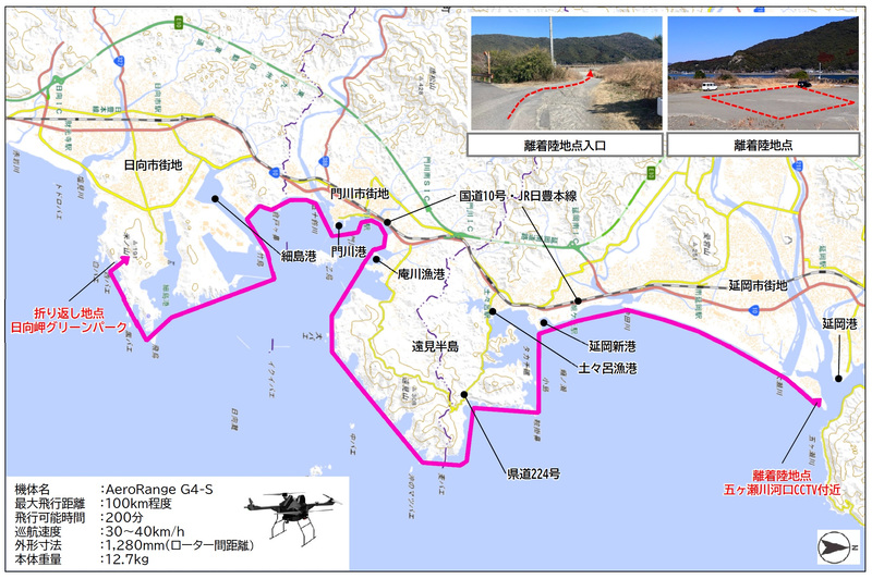 ハイブリッドドローンは、燃料とバッテリーで駆動し、長時間飛行かつ長距離移動が可能。無人地帯での補助者を配置しない完全目視外飛行(レベル3.5飛行)で実施する。延岡から日向間沿岸まで片道36kmを往復飛行し、延岡市沿岸の港湾施設、河口部、海浜、半島等の地域の状況を撮影し、取得した映像の実用性や3次元点群データの精度を検証する。