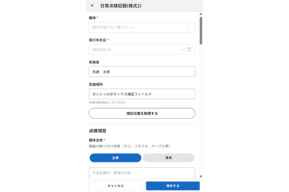 各点検項目に対して「正常/異常」を選択するボタンを設置し、直感的な操作が可能。入力漏れを自動で検出する機能を備え、正確な記録を支援する。デバイスのGPS情報を活用し、現在位置の緯度・経度情報の自動入力が可能。