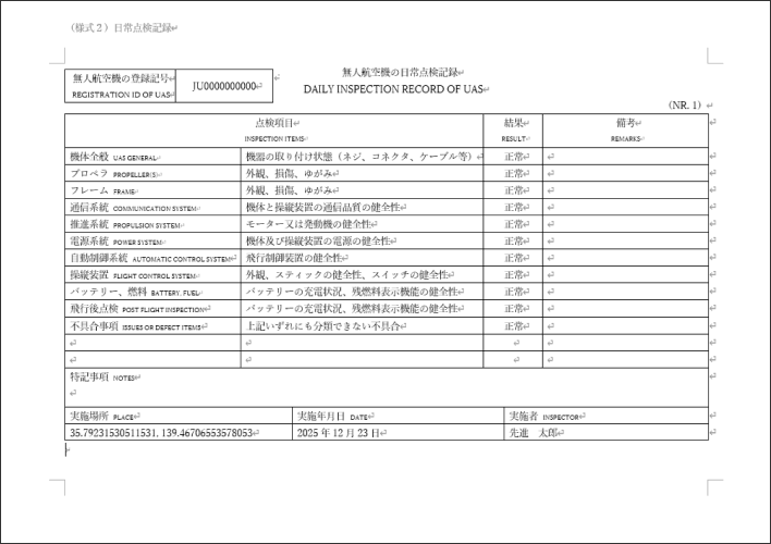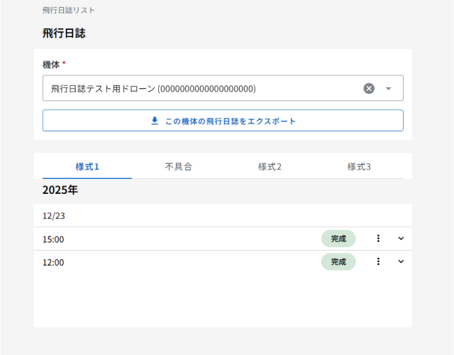 機体ごとの飛行日誌をエクスポート可能。それぞれ国土交通省の標準フォーマットで出力される。