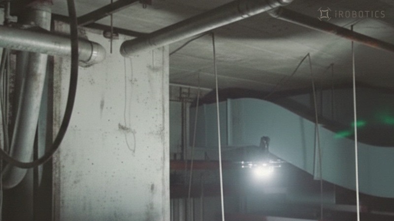 写真:ライトで照らしながら天井裏を飛行するドローン