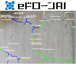 閉鎖空間・暗所における安全かつ高精度な点検を実現する専用ドローン。人が立ち入ることが難しい環境でも安定飛行が可能で、飛行と同時に設備の3Dデータ化を行う。国土交通省「上下水道DX技術カタログ」掲載技術。 - AIによる解析・診断「eドローンAI」