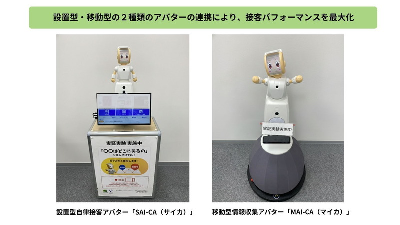 案内業務の遂行には、来訪者の質問や現場状況に応じた柔軟な案内内容の変化に加え、現場での失敗や対応履歴をもとに正しい業務知識の継続的な学習・更新が重要となる。実証では、設置型自律接客アバター「SAI-CA(サイカ)」と移動型情報収集アバター「MAI-CA(マイカ)」の2種類を活用。移動型情報収集アバターが現地を巡回して収集した最新の施設情報や状況変化を、遠隔地にいるオペレーターが即座に把握・整理することで、現地に赴くことなく詳細な最新情報を設置型自律接客アバターの案内に反映する運用を目指す。なお、実証期間のうちMAI-CAは2月23日から26日、3月2日から5日の計8日間のみ稼働する。