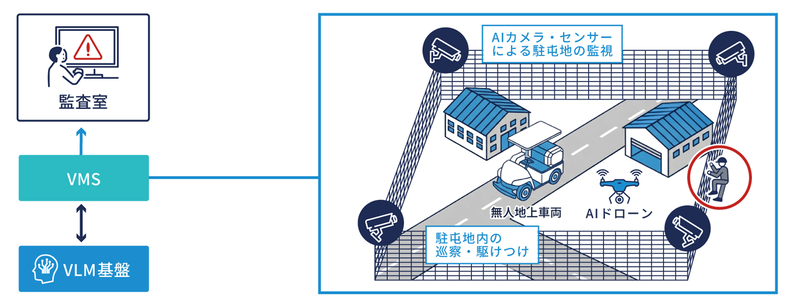 このシステムは、固定型のAIカメラ・センサーとVMS(Video Management System)、視覚言語モデルVLM(Vision-Language Model)基盤、無人地上車両UGV(Unmanned Ground Vehicle)、AIドローンがセキュアなネットワーク基盤で連携し、24時間365日体制で駐屯地内の警備・巡回体制を支援する。両社は持続的な警備運用体制の確立に向けてシステムの構築・提供を行う。