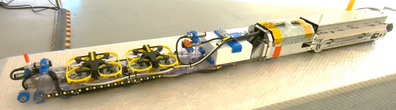 その結果、接続管とペネトレーションに芯ずれがあると段差で引っ掛かりが発生することがわかった。引っ掛かりを緩和するため、装置中部のタイヤを改良するとともに、5つのタイヤをアーチ状に配置し、段差をなだらかに乗り越えるようにした。さらに、グローブボックスから押し棒でインストールの補助を実施する手順の追加と、グリップ力を向上させるためクローラー接地面の改良を行った。