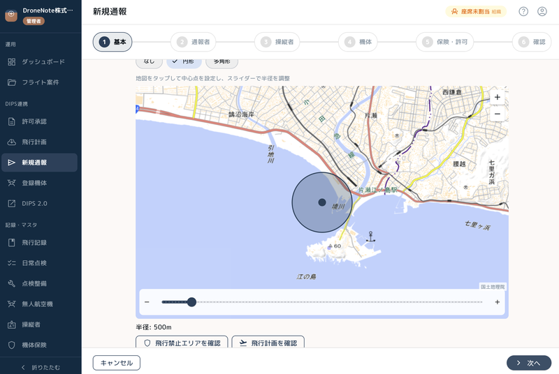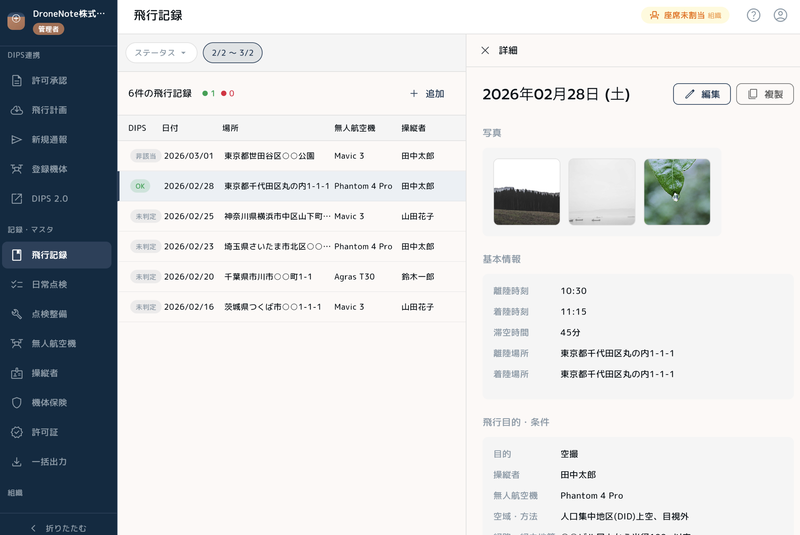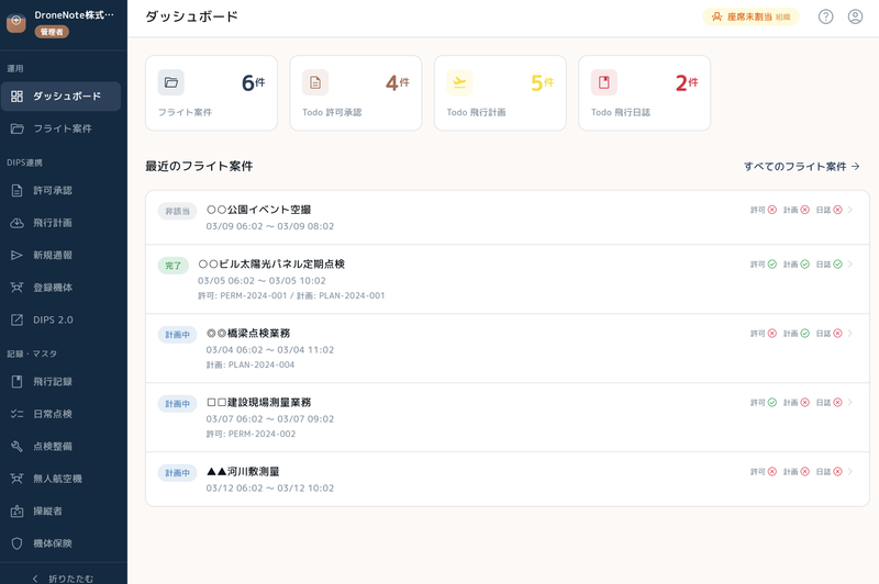 DIPS 2.0と連携し、飛行許可承認・飛行計画・機体登録情報をポータル上で確認・管理が可能。飛行計画の通報にも対応しており、DIPSに登録済みの情報と飛行日誌の紐付けにより、法令遵守状況を一目で把握できる。 - フライト案件ダッシュボード