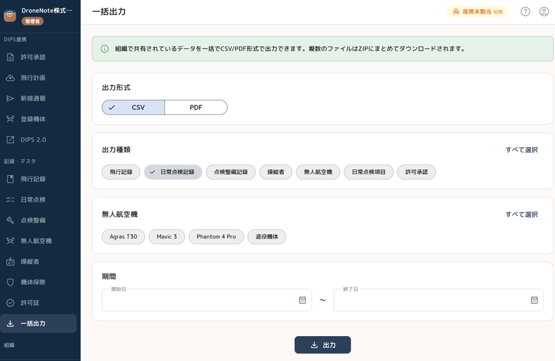 飛行記録、日常点検記録、点検整備記録、機体情報、操縦者情報など、各種データのCSV出力およびPDF出力に対応。監査や報告書作成の効率化に貢献する。 - 機体・操縦者マスタの組織共有