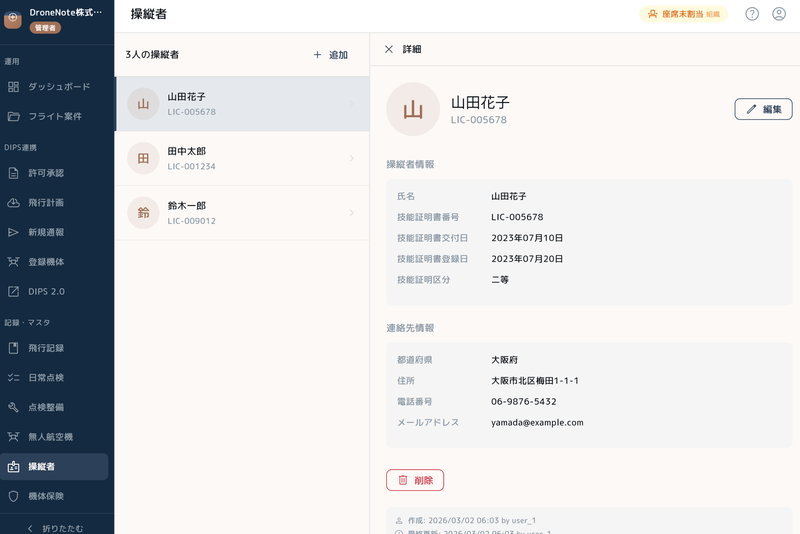 ドローンと操縦者の情報をWeb管理ポータル上で登録・編集し、組織メンバー間で共有。モバイルアプリとのデータ連携により現場での入力負荷を軽減する。 - 個人ユーザーにも対応