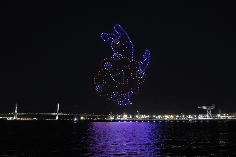 会場となったみなとみらいの夜空には、GREEN×EXPO 2027公式ロゴや公式マスコットキャラクターのトゥンクトゥンクなどが次々と浮かび上がり、夜景と一体となった幻想的な演出が行われた。さらに、国際博覧会のホストシティをつなぐ演出として、2025年に開催された大阪・関西万博の公式キャラクターであるミャクミャクが夜空に登場し、トゥンクトゥンクと夜空で共演した。会場には約6,000人が来場し、GREEN×EXPO 2027への期待感を高める一夜となった。