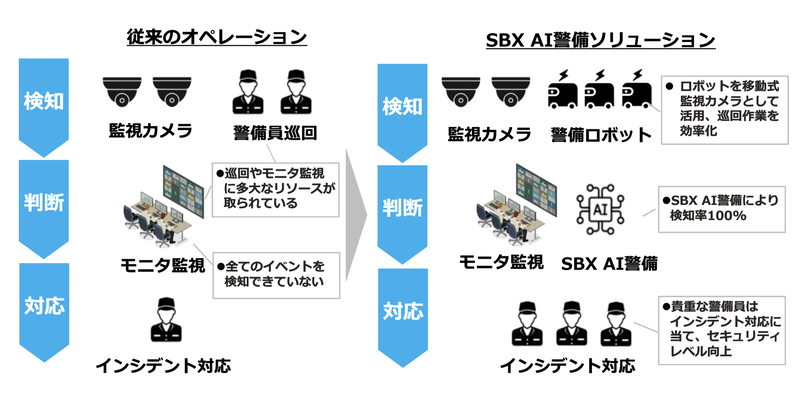 ソフトバンクロボティクスとRSCは、合弁会社AI Remote Securityを通じて2026年中に「AIロボット遠隔警備サービス」の提供開始を目指す。遠隔での警備カメラモニタリングと、すでに提供を開始しているロボットと警備員を組み合わせた次世代警備ソリューション「SBX AI警備」を活用することで、インシデント予兆の100%早期発見を少人数で可能にする。あわせて、施設には次世代AI警備ロボット「SBX Security Robot S1」などの警備ロボットを配置し、警備員が駆けつけるまでの間に警備ロボットを遠隔操作することで、現場状況の詳細確認や警告を行う。