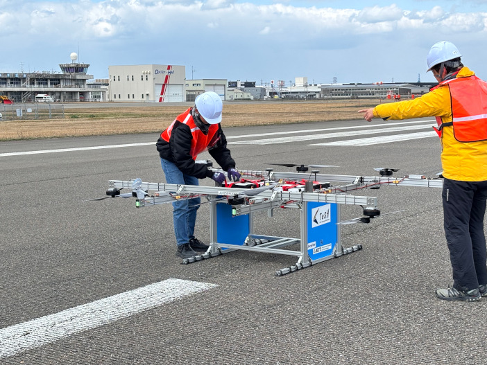 2026年3月10日、金沢工業大学 航空宇宙工学科の赤坂剛史教授は、最大積載量50kg・飛行距離50km超のVTOL(垂直離着陸)型有翼電動ドローンの飛行実験を福井空港で実施した。この飛行実験は、坂井市が推進する2025年度「新産業共創事業」に採択され実施したものとなる。