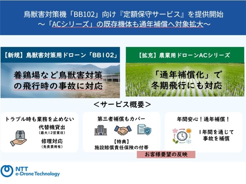 NTT e-Drone Technology(以下、NTTイードローン)は、新型鳥獣害対策用ドローン「BB102」の利用者を対象とした定額保守サービスを、2026年4月1日より開始する。また、農業用ドローンACシリーズ(AC102、AC101 connect)の定額保守サービス利用者についても、要望が多かった通年補償(冬期免責の撤廃)を実施し、同日よりサービス内容を大幅に拡充する。