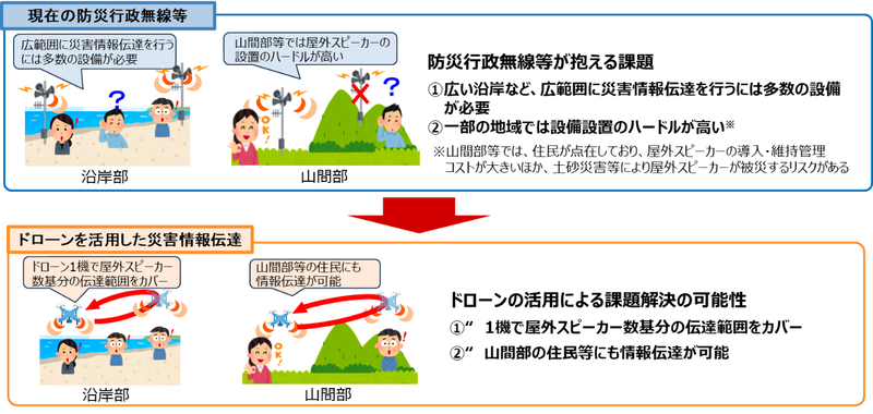 この事業では、災害時に住民へ迅速かつ確実に情報を伝達する手段として、スピーカー搭載ドローンを防災行政無線等の補助手段として活用する際の留意事項や必要な要件を整理した。
