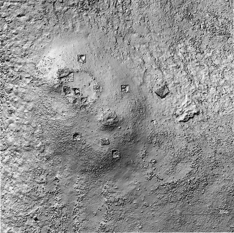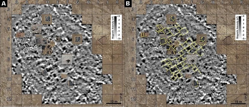 地中磁気探査と地中レーダー探査の結果から、遺跡の中央付近に長方形の建築物が、互いに壁を共有するようにして密集して分布していること、巨大な公共建築物や広場のような構造が見られないことがわかった。