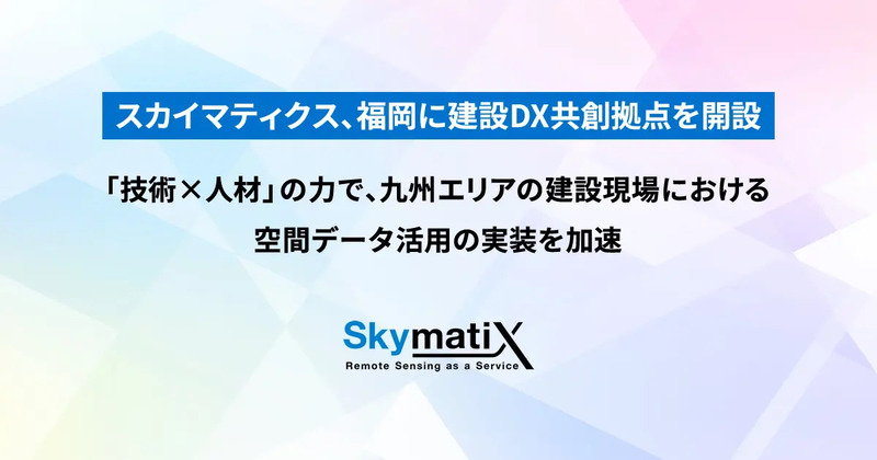 2026年4月8日、スカイマティクスは九州エリアの建設現場DXを加速させるため、福岡県に新たな共創拠点を開設したことを発表した。ドローン測量や3Dデータの導入における運用の壁を解消し、地域密着型のハンズオン支援を行う九州の中核拠点とする方針だ。