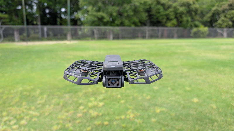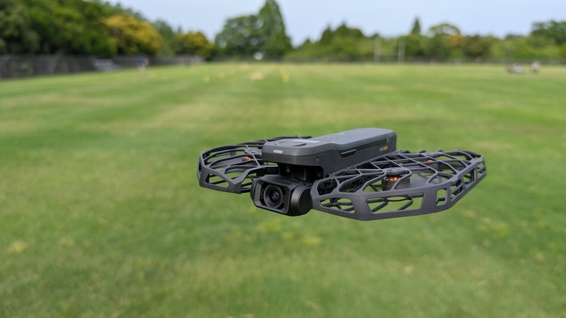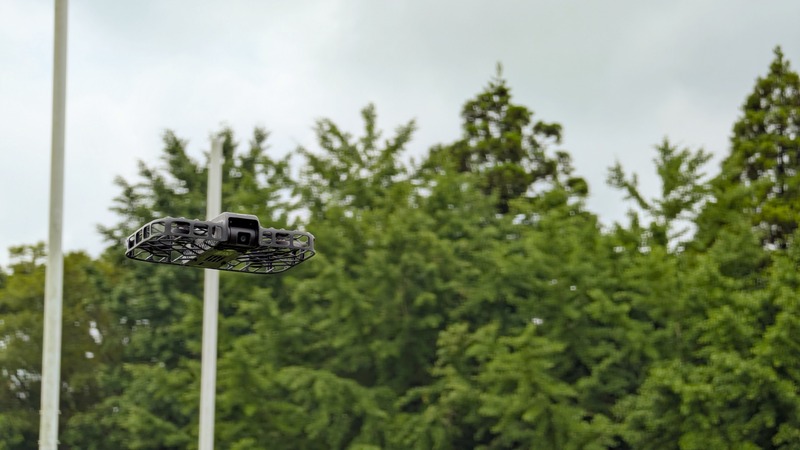 Smartが飛行する様子。軽量なドローンのため、航空法に該当しないという利点があるものの、屋外では風にやや影響される。多少の風であれば、映像はブレることなく録画できる。