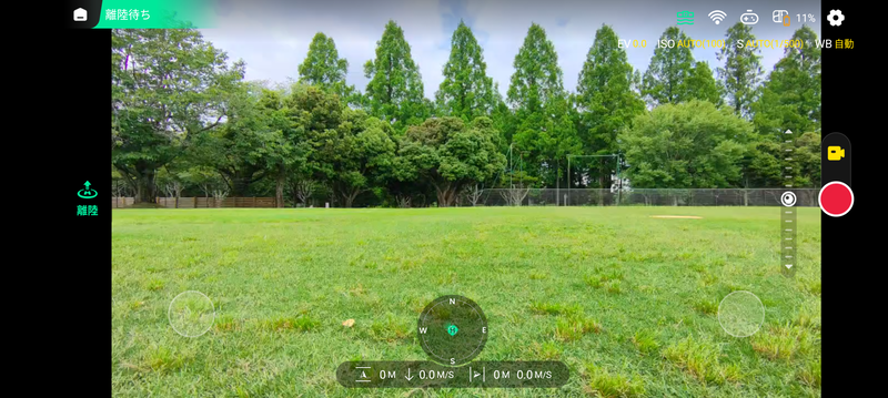 スマートフォンを接続し、プロポのモニターとして使用したときの画面。離陸地点からの距離や撮影に関する情報などが表示される。