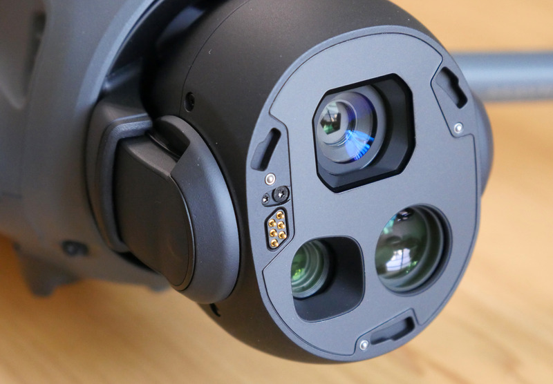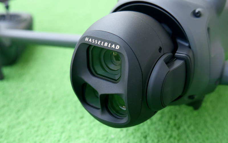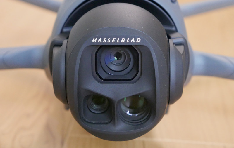 ロール角360°回転するカメラとジンバルは特徴的な球体デザインを採用。上部カメラがHasselblad製メインカメラ(焦点距離28mm・f2.0~11)であり、正面左側下が中望遠カメラ(焦点距離70mm・f2.8)、正面右側下が望遠カメラ(焦点距離168mm・f2.8)となっている。送信機の画面上にある選択メニューをタップするだけでレンズを変更して撮影することができるほか、デジタルズームにも対応する。