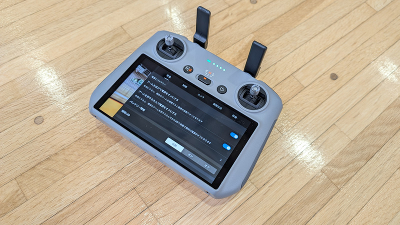 送信機は「DJI RC-N3」および「DJI RC 2」に対応しており、今回はDJI RC 2を使用した。5.5インチのフルHDディスプレイは視認性が高く、操作時のグリップ感も良好であった。左右の人差し指が自然にフィットするデザインも操作性を高めている。なお、送信機は前モデルや「DJI Neo」など、直近1年ほどの間にDJIから発売された機体と共通だ。