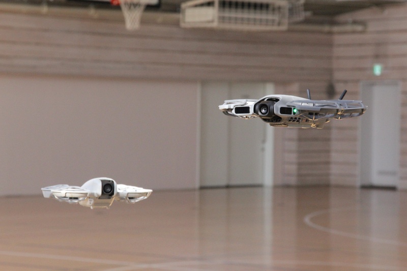 手のひらに機体を置き、フォローモードで飛行開始ボタンを押すと、英語音声で「3、2、1」とカウントダウンが流れ、その後離陸する。そして、歩いたり走ったりと周囲を移動してみたが、トラッキングが外れることなく、被写体にしっかりと追従して撮影してくれた。ドローニーモードでは、体育館の対角線を目いっぱいに使って飛行しながら撮影。画角の広いレンズが周囲の景色をほどよく取り込み、景観の良い場所で飛行させれば、印象的な映像が撮影できそうだと感じた。
