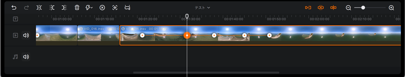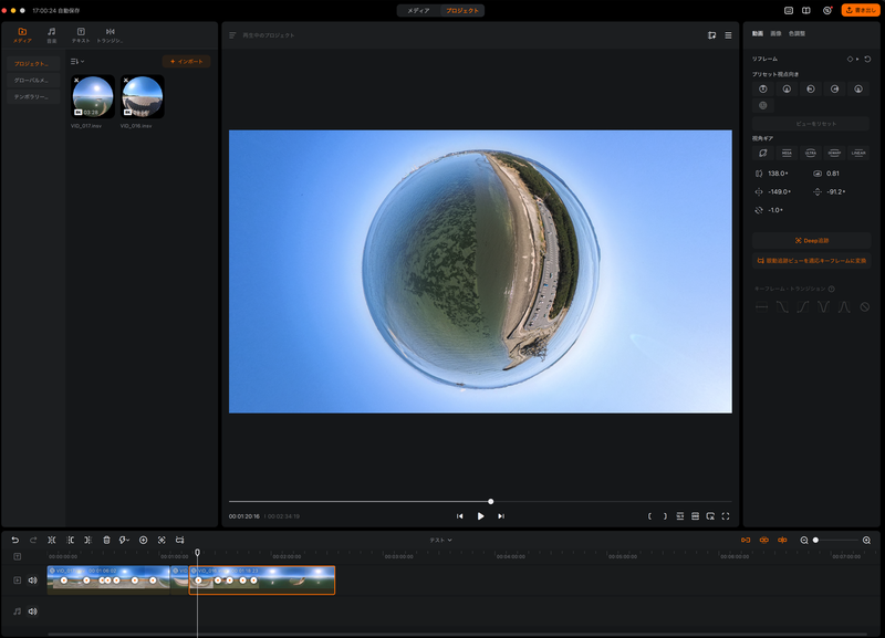 例えば、動画の20秒地点にキーフレームを設定し、画角を後方に指定すると、その手前(17秒くらい)から自動的に画面が横方向に移動し、20秒時点で後方を向いた映像となる。このように、時間(フレーム)と画角を紐づけて設定することで、映像の動きを構築していくのが基本的な編集作業となる。この機能により、撮影時にカメラの向きを細かく調整する必要はなくなる。