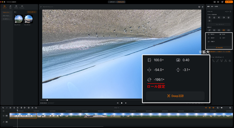 実際にロール(横回転)を設定してみよう。作業は編集画面右側にある設定値を変更するだけで簡単だ。