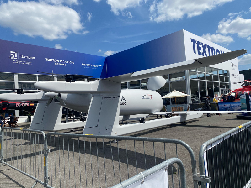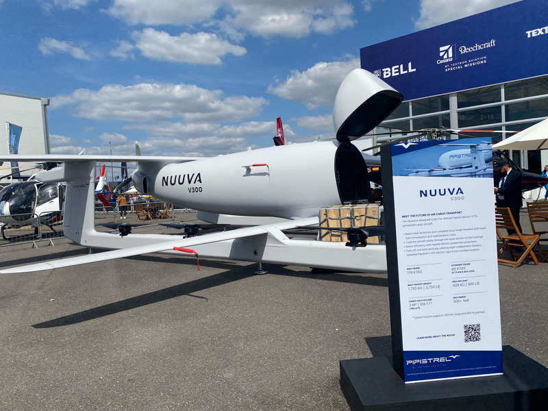 Pipistrelの展示で最も注目を集めたのは、1月に初の飛行試験を行った貨物輸送用の大型ハイブリッドeVTOL無人航空機「Nuuva V300」の展示でした。この機体は、垂直離着陸用に8基のバッテリー駆動Pipistrel E-811電気エンジン(Velis Electroと同様)を使用し、水平飛行には内燃機関によるプッシャープロペラを採用しています。前方から貨物を積載する設計で、ペイロードは272〜408kgとなっています。