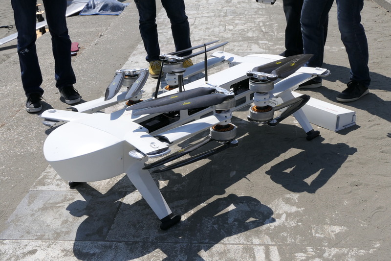 機体名の「135」は最大飛行重量135kgを表しており、38インチのプロペラを持つローター8つを2つずつ二重反転式にして搭載。そのサイズは全長約230cm、全幅約245cm、全高約40cmと巨大で、アルミをCNCで削り出して作り出された機体は約60kgもあり、展示飛行前には4人のスタッフに抱えられて離陸場所まで運ばれていた。
