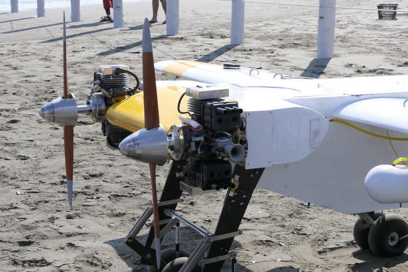 1機目は電動機の「D-5」で、ウイングスパン約3mの機体はブラシレスモーター2基を搭載し、巡航速度約60km/hで最長約2.5時間、約150kmもの距離を飛行することが可能だ。カタパルトによる離陸から飛行、そして着陸までプログラムによる全自動で行うことが可能となっている。