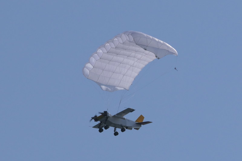 もう1機はガソリンエンジンを搭載した「W-T」だ。水平対向2気筒の86cc2サイクルエンジンを2基搭載するほか、この日は機体後部にタービンエンジンも搭載。興味深いのは一見すると高翼スタイルの航空機だが、実は浮力は機体上面に取り付けたパラシュートが担い、モーターパラグライダーのように飛行するということ。パラシュートを付けたまま離陸して飛行、着陸するため、墜落するということがないのが最大のメリットだという。もともとは短距離離着陸システムとして生まれたこのパラシュートを使った方法は、大きな浮力が得られるため、約20kgの荷物を積んで約50km飛行できる。