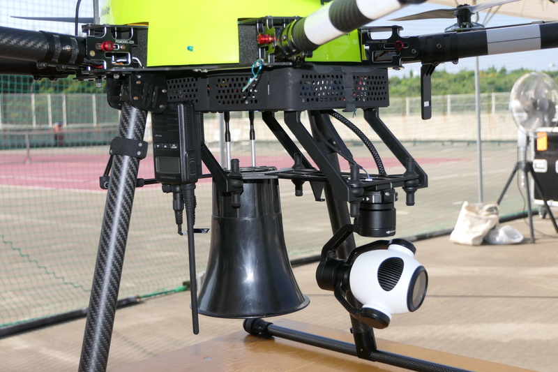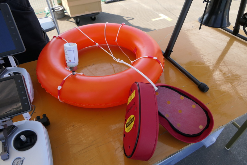 DJI製品の販売やDJIアリーナを運営する一方で、顧客のニーズに合わせた独自の機体開発やカスタマイズを行っている日本サーキットは、海上や河川でおぼれている要救助者に向けて浮き輪を投下するドローンを披露した。同社オリジナルの「JH950」をベースに浮き輪投下装置とスピーカーを搭載した浮き輪搭載ドローンは、2年ほど前からさまざまな防災訓練などで披露されているが、今回はDJIのInspire2とのコンビネーションで、要救助者を発見し、そこへ浮き輪搭載ドローンが駆けつけて浮き輪を投下する、という実践的な活用事例としてデモフライトを行った。