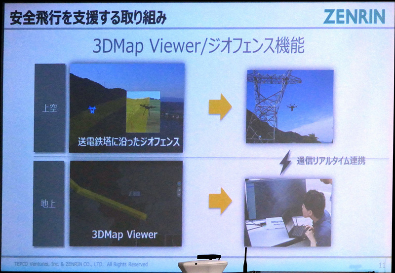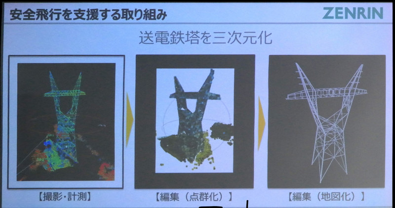 次に説明に立ったのはゼンリンの竹川道郎氏。様々な形で日本全国100%を地図化しているという同社では、ドローンハイウェイの空域データの生成を担当した。今回の検証においては、ドローンなどを使って送電鉄塔を三次元データ化。いわゆるSfM技術を使って点群データを作成し、それを地図化して飛行するドローンに提供する。データには送電鉄塔や送電線を包むようにジオフェンスを設け、飛行するドローンが送電網に沿って飛行しながらも、送電鉄塔や送電線に近づかないようにしている。また、このデータは地上でドローンの飛行を監視するオペレーターの端末に「3D Map Viewer」としてルートを視覚的に表示される。