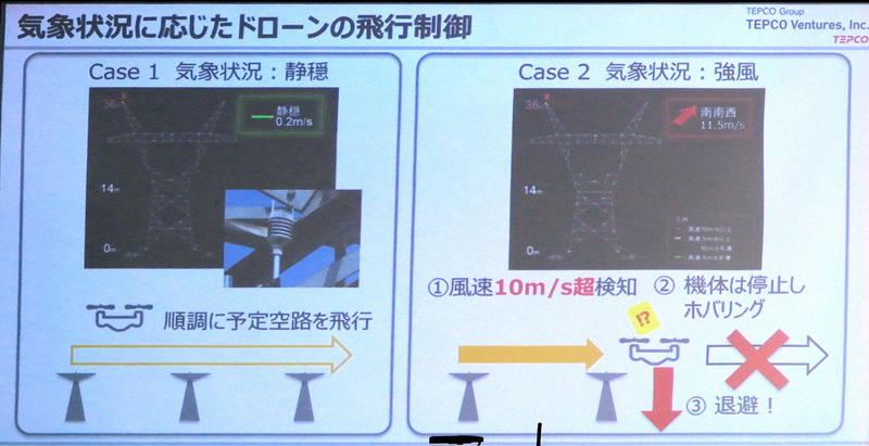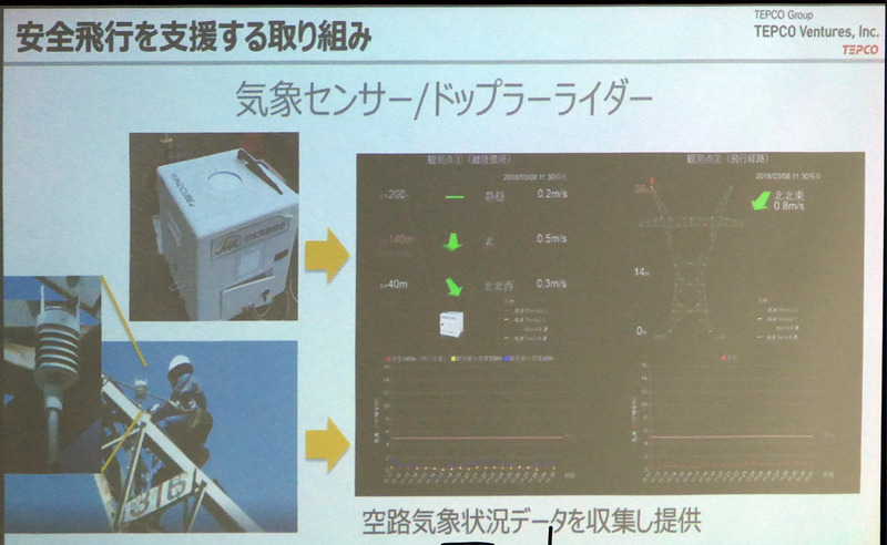 今回の実証実験に向けて東京電力ベンチャーズでは、ドローンハイウェイを担う送電鉄塔に、風速と風速を計測する気象センサーを設置すると同時に、ドローンの離発着地点には地上から200mの高さまでの風況を観測できるドップラーライダーを設置。これらから得られた情報をリアルタイムにドローンに提供し、10m/sを超えるような強い風が吹いている場合には、飛行中のドローンはその場で停止してホバリングしたり、必要に応じて着陸するなどして安全を確保するという。また、これら気象センサーやドップラーライダーがから得られた情報をビッグデーター化して、風況予測技術を確立するのにも役立てると赤塚氏は説明。さらに、将来はこの気象データをもとに、ドローン自ら安全な飛行経路にリルートするような仕組みにも役立ててほしいと期待を寄せる。