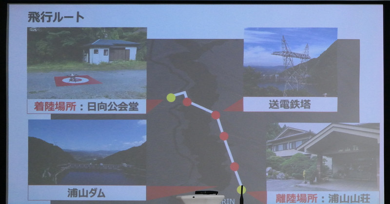 これまではゴルフ場や同社が設定した飛行コースの中で実験を行ってきたが、今回は埼玉県秩父市の浦山ダム湖沿いにある、約3kmのドローンハイウェイを利用。実験はダム湖上流側にあるの日向公会堂の顧客が、ショッピングアプリで弁当を注文すると、約2km下流のダム下にある旅館の浦山山荘からドローンが弁当を届けるというものだ。ダム湖の左岸側には湖岸に沿って東京電力の送電鉄塔が立ち並んでおり、浦山山荘を離陸したドローンは自律飛行でドローンハイウェイまで進み、そこからは目的地に最も近い場所までハイウェイに沿って飛行。再びハイウェイを離れて日向公会堂まで飛行して着陸し、弁当が入った箱をリリースして、再び同じルートを戻ってきた。