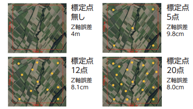 つまりPix4Dmapperは、モノの形を復元する前に、まずは撮影したカメラの場所を特定することを初期処理で行うということが、他のSfMソフトとウェアの大きな違い。この“位置を特定する”ということにとりわけ重きを置くPix4Dmapperのコンセプトは、結果として精度が求められる測量分野において強みとなるわけだ。Pix4Dmapperの精度は非常に高く、Pix4D社によると標定点は広さに関係なく5点~ 7点あれば問題なく、3点でも十分な精度が出せるという。事実、Pix4D社の検証では、地上分解能4cmで1.7km×1.5kmの広さを2892枚撮影したモデルでは、標定点がない場合はZ軸の誤差が4mだった。そこで5点の標定点を置くと誤差9.8cmとなり、12点で8.1cm、20点で8.0cmとなったという。この結果からすると、5つの標定点を置くだけで、それ以上の数を設置した場合と比べても、精度にそれほど大きな差がないことがわかる(図1)。