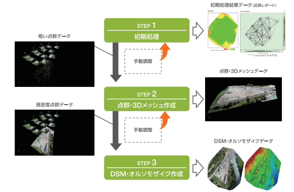 もうひとつPix4Dmapperの特徴を挙げるとするならば、オペレーションの簡単さだ。画像ファイルと撮影位置情報視準点、検証点位置情報をインポートして、開始ボタンを押しさえすれば、初期処理から点群・3Dメッシュの作成、さらにDSM・オルソモザイクの作成までを一度に行ってくれる。原則として途中でパラメーターを設定するといった操作が必要ないため、データ生成が完了するまでこの作業に張り付いておく必要がないわけだ(図2)。