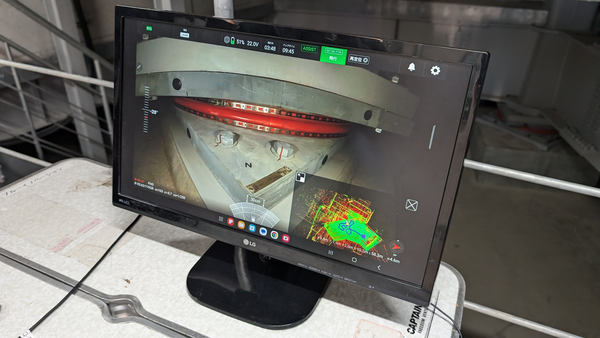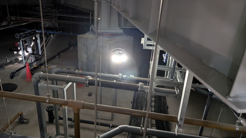ELIOS 3のデモは物流棟の下部にある配管等が通るスペースで行われた。粉塵が舞うためマスクを着用しスペースの中へ入ると、球体ガードをまとうELIOS 3がすでに飛行していた。屋内環境下で衛星からの位置情報取得は不可能。それにもかかわらず安定して飛行している姿には頼もしささえ感じる。LEDライトは点検部位を照射するには十分な明るさだ。案内用に設置されたモニターにはELIOS 3に搭載されたカメラからの映像が映し出されていたが、点検部位をはっきり見て取れた。映像から目視でクラック等の損傷を見つけることは難しそうだが、各種センサーからの情報と映像から読み取れる情報を組み合わせて、点検部位の状態を適切にチェックできると理解できた。