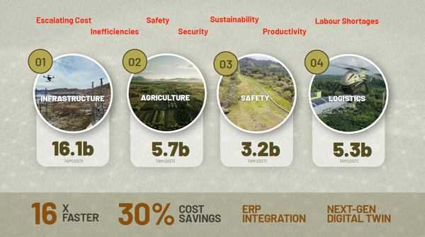 同社のソリューションは、インフラ、農業、セキュリティ、物流の4つの産業分野に焦点を当てている。これらの分野で、コスト削減、効率化、安全性向上、持続可能性の確保、生産性向上、そして労働力不足という課題に対応するソリューションを提供しているという。同社のテクノロジーを使用することで、従来の方法と比べて最大16倍のスピード、30%低コストで業務を遂行できるとカマルル氏は強調する。
