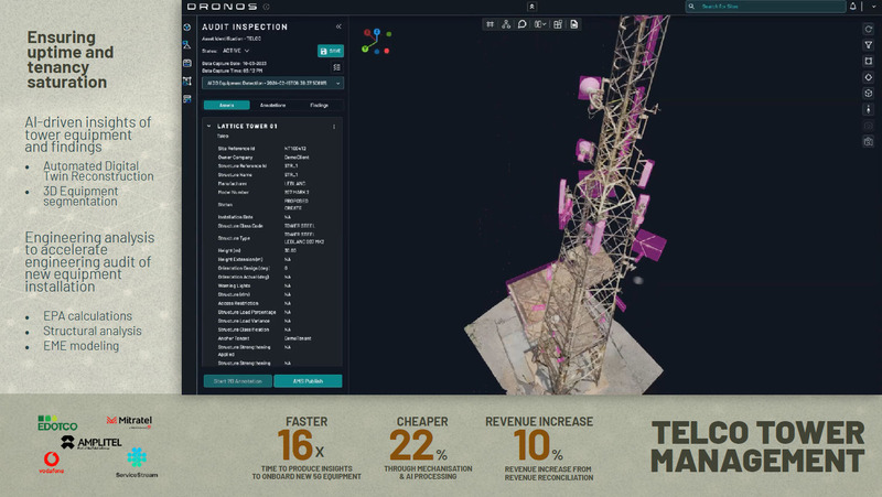 カマルル氏は同社のソリューションの例として、通信塔の点検を紹介した。従来2〜3日かかっていた作業を、ドローンによる5分間の飛行データとAI解析で完了させることができるという。飛行データはデジタルツインとして展開され、AIで解析することによって、通信アンテナの点検を効率化するだけでなく、新たなアンテナ設置の可能性や受信角度の微調整を示唆するなど収益を増加させる効果も生み出している。