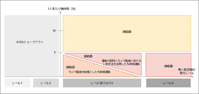 一方で、レベル1またはレベル2飛行に該当するケース(ドローンショーなど)は本ガイドラインの対象外としている。また、1:5を超える運航やレベル4飛行における多数機同時運航を本ガイドラインは制限するものではく、これまで通り個別審査での飛行許可・承認取得後に飛行が可能となることに留意が必要としている。