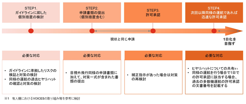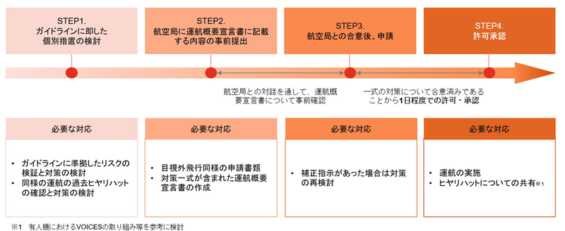 レベル3.5飛行で多数機同時運航を行う場合、審査要領に基づく申請に加え、本ガイドラインに記載の個別の措置を運航概要宣言書に記載する対応が必要となる。なお、運航概要宣言書は航空局との事前合意が必要となる。申請は不備等がなければ、1日程度で許可・承認されるとしている。