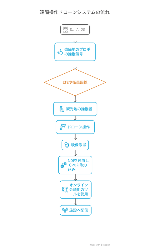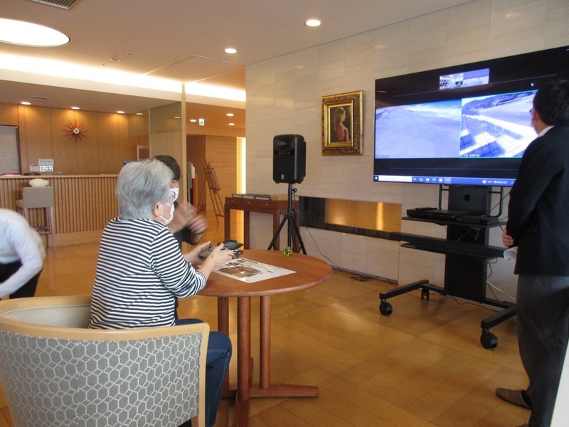 SKY TRYING代表の池田氏は「使用した機体はDJI Air 2Sです。遠隔の施設に設置されたプロポの操縦信号はLTEや衛星回線を介して観光地にいる操縦者のプロポに伝わり、その電波で観光地のドローンを操縦します。ドローンの映像はNDIを経由してPCに取り込み、オンライン会議用のツールを使用して施設へ配信しました」と遠隔操縦の仕組みを解説した。遠隔操縦はRed Dot Drone Japanが開発する遠隔操縦アプリ「dQue」を使用している。同アプリは数百~数千km離れたドローンも操縦できる同社独自の技術で作られており、今回の取り組みにも有効に活用された格好だ。