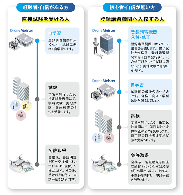 山本 :エネコムが提供するeラーニングサービス「EneLearn Drone Meister」は、国家資格向けに「二等初学者学習コース」「二等経験者学習コース」「二等学科試験対策コース」「二等口述試験対策コース」の4つのコースを、民間資格や入門者向けに「基本学習コース」を準備しており、国家資格の取得や優れたドローンパイロットの育成を支援しています。登録講習機関(ドローンスクール)やドローンビジネスを営む法人、指定試験機関での一発試験に挑戦する個人の方も受講できます。