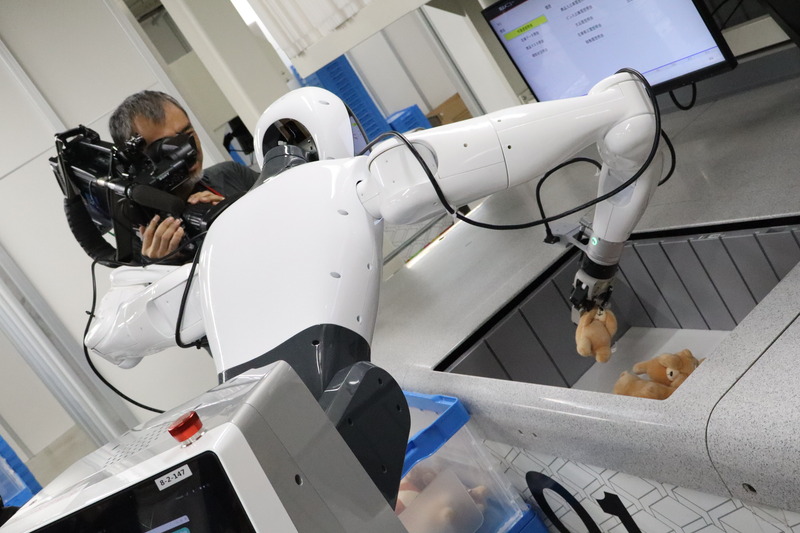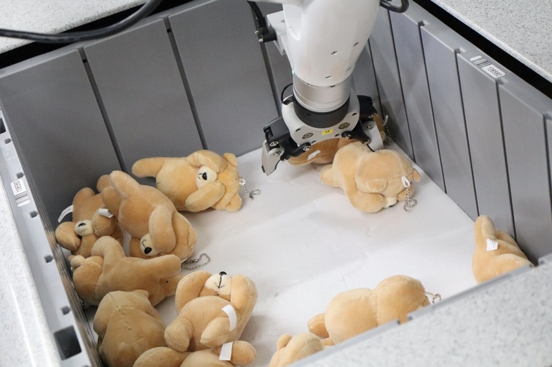 今回の発表会では、手のひらサイズのぬいぐるみを掴んで移動させる様子が公開された。掴みやすく、弾力があって滑りにくい素材のため、正確に場所を移していく様子が見られた。なお、移動させる物の位置は顔に備えられたカメラと腕に装着されたカメラで捉え、追尾して掴むことができる。試しに担当者がぬいぐるみを棒で転がして邪魔をすると、ロボットは常に物を追いかけて掴む動作を取っていた。