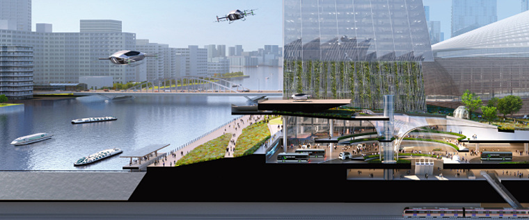 「築地地区まちづくり事業」空のモビリティバーティポートのイメージパース