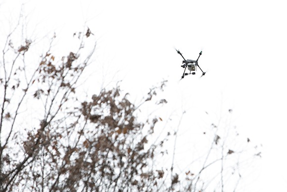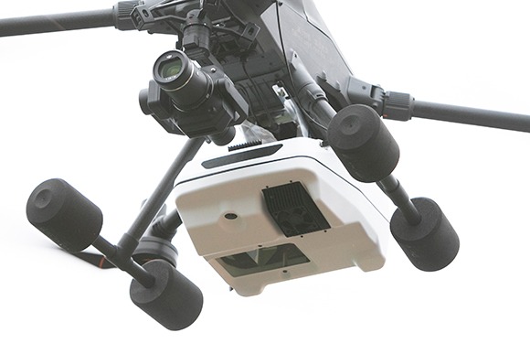 TDOT 7 GREEN LITEを搭載したドローンは、DJIのアプリであらかじめ設定したルートに従って離陸から計測まで行う。一般的なレーザースキャナでは、離陸前にスキャン開始、着陸後にスキャン停止の操作を行う必要があるほか、飛行中のスキャナの状態は確認することができない。