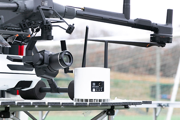 講習会の冒頭ではTDOT 7 GREEN LITEによるデモフライトが行われた。本機を搭載するドローンはDJIから今夏リリースされたばかりの「Matrice 400」だ。会場となった、総合スポーツ施設である千年の森J-Wingsの上空を自動航行で飛行するデモンストレーションを行った。
